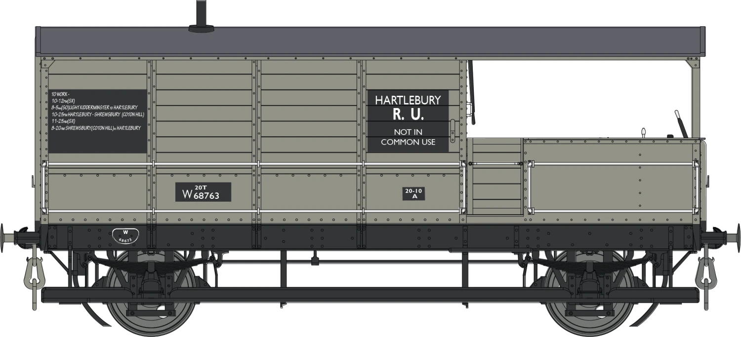 After World War One in 1918, more 20-ton vans to the improved design were built with G W R self-contained buffers and given Diagram AA15. A total of 378 were built between 1918 and 1927. The next development was the AA19 which were built between 1927 and 1931 incorporating many RCH parts such as buffers and axleboxes but utilising the same body. The total constructed was 221 vans. Diagram AA 20 followed which was externally identical to the AA19 vans with a total of 354 being built between 1934 and 1943.