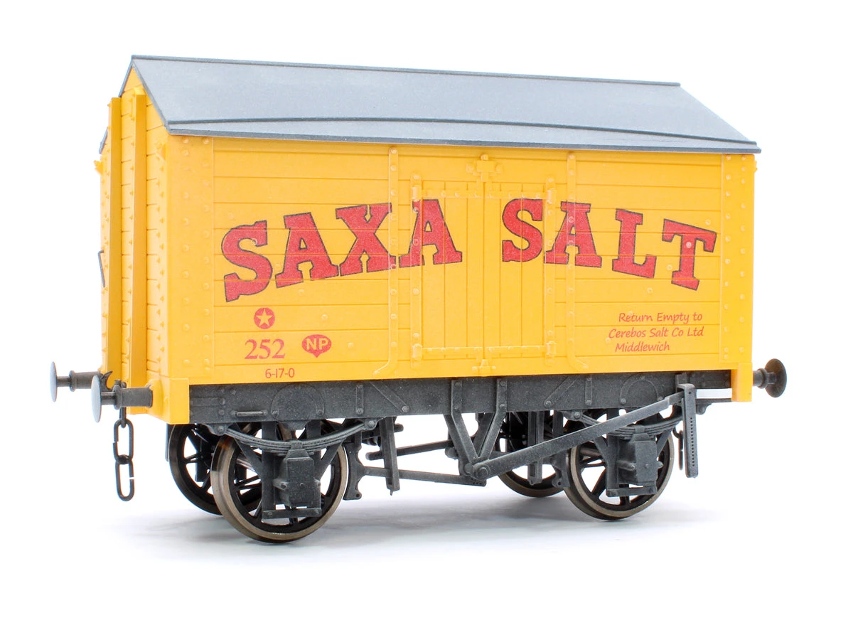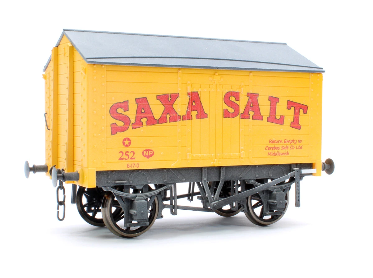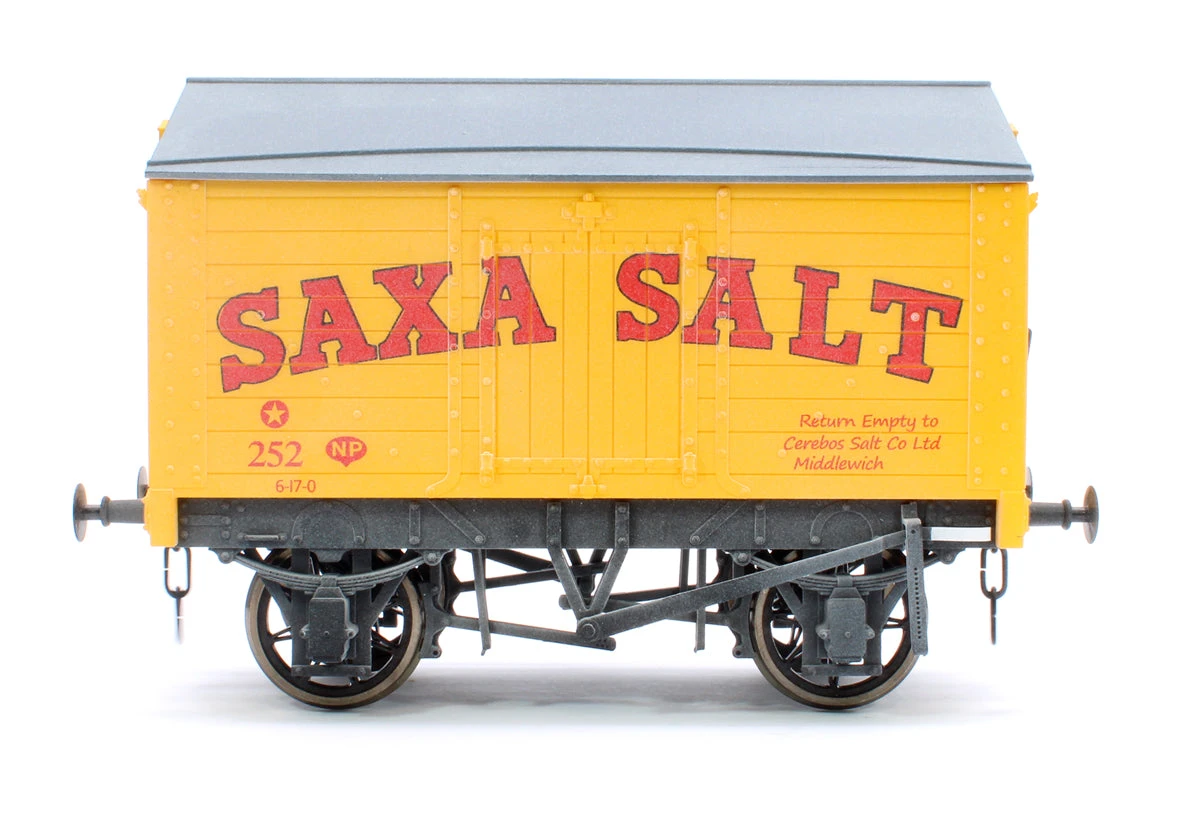 Once processed, the salt had to be kept dry and was transported in bags in high sided wagons with weather proof, usually pitched roofs. Private owner wagons for salt were common and where the salt was for table use, the vans used were often elaborately decorated with the suppliers branding. Salt wagons were in use commonly right up to the 1970s and several are now in preservation.